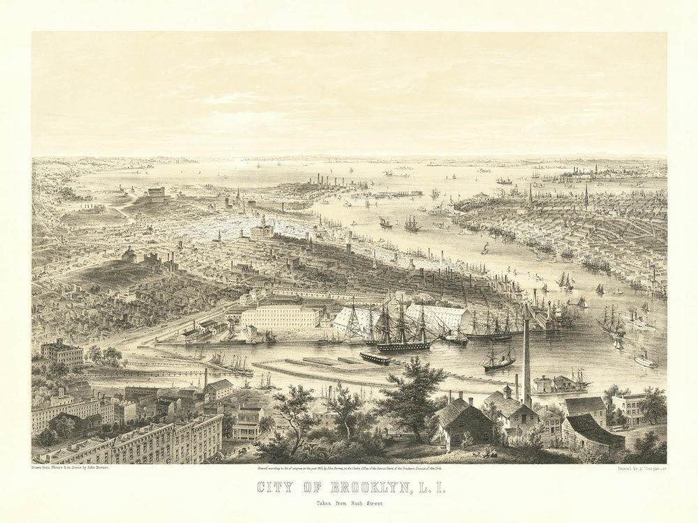 Diese Karte ist ein Zeugnis von Brooklyns rascher Transformation in den 1850er Jahren, einem Jahrzehnt, in dem die Stadt sowohl in der Bevölkerung als auch in der wirtschaftlichen Stärke wuchs. Die Präsenz bedeutender Wahrzeichen wie des Brooklyn Naval Yard, zusammen mit dem geschäftigen Schiffsverkehr auf dem Fluss, veranschaulicht die doppelte Identität der Stadt als Zentrum der Industrie und Tor zur weiteren Welt. Die sorgfältige Einbeziehung von Lower Manhattan in der Ferne dient als eindringliche Erinnerung an die engen Verbindungen zwischen diesen beiden urbanen Riesen, selbst vor dem Bau der Brooklyn Bridge.