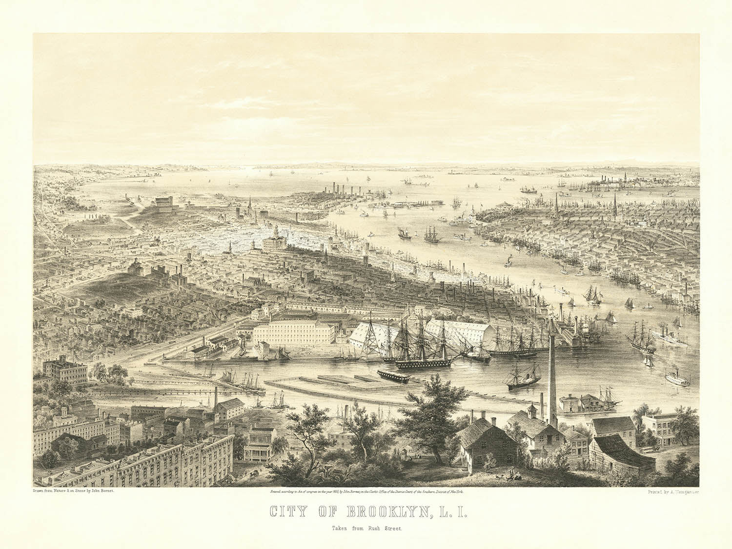 Betreten Sie die dynamische Welt von New York im mittleren 19. Jahrhundert mit „City of Brooklyn, L.I. Taken from Rush Street“, einer seltenen und eindrucksvollen Vogelperspektive, die der talentierte Künstler und Lithograf John Bornet 1855 geschaffen hat. Diese bemerkenswerte Karte fängt Brooklyn in einem transformativen Moment ein, zwischen seinen pastoralen Wurzeln und einer aufstrebenden industriellen Zukunft. Der Aussichtspunkt von Williamsburg aus schwenkt nach Südosten über den Brooklyn Naval Yard und bietet ein panoramisches Tableau, das nicht nur die Stadtteile Brooklyn Heights und DUMBO umfasst, sondern auch die ikonische Skyline von Lower Manhattan, die über den East River schimmert.