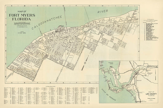 Frank B. Dolph, ein renommierter Kartenmacher aus der Mitte des Jahrhunderts mit Sitz in Fort Lauderdale, brachte einen akribischen Blick und regionale Expertise in seine kartografische Arbeit ein. Seine Karten sind bekannt für ihre Klarheit, Präzision und historischen Wert, und diese Ausgabe von Fort Myers ist da keine Ausnahme. Dolphs Liebe zum Detail zeigt sich in der sorgfältigen Beschriftung wichtiger Wahrzeichen - wie dem Rathaus, dem Gerichtsgebäude von Lee County und dem geschäftigen Yachthafen - jedes ein Zeugnis für den wachsenden bürgerlichen Stolz und den Gemeinschaftsgeist der Stadt in den 1940er Jahren.