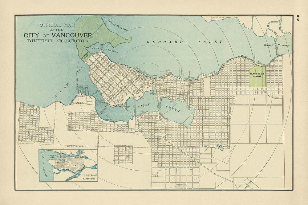 Eines der auffälligsten Merkmale dieser Karte ist die Darstellung der Grünflächen Vancouvers, einschließlich des zukünftigen Stanley Parks, einem weitläufigen Gebiet der Wildnis, das zu einem der ikonischsten Wahrzeichen der Stadt werden würde. Im Osten ist Hastings Park deutlich beschriftet, was seine frühe Bezeichnung als öffentliches Erholungsgebiet widerspiegelt. Diese Parks, vor dem Hintergrund eines wachsenden städtischen Rasters, veranschaulichen die durchdachte Planung der Stadt und das Engagement, natürliche Räume trotz schneller Entwicklung zu bewahren.