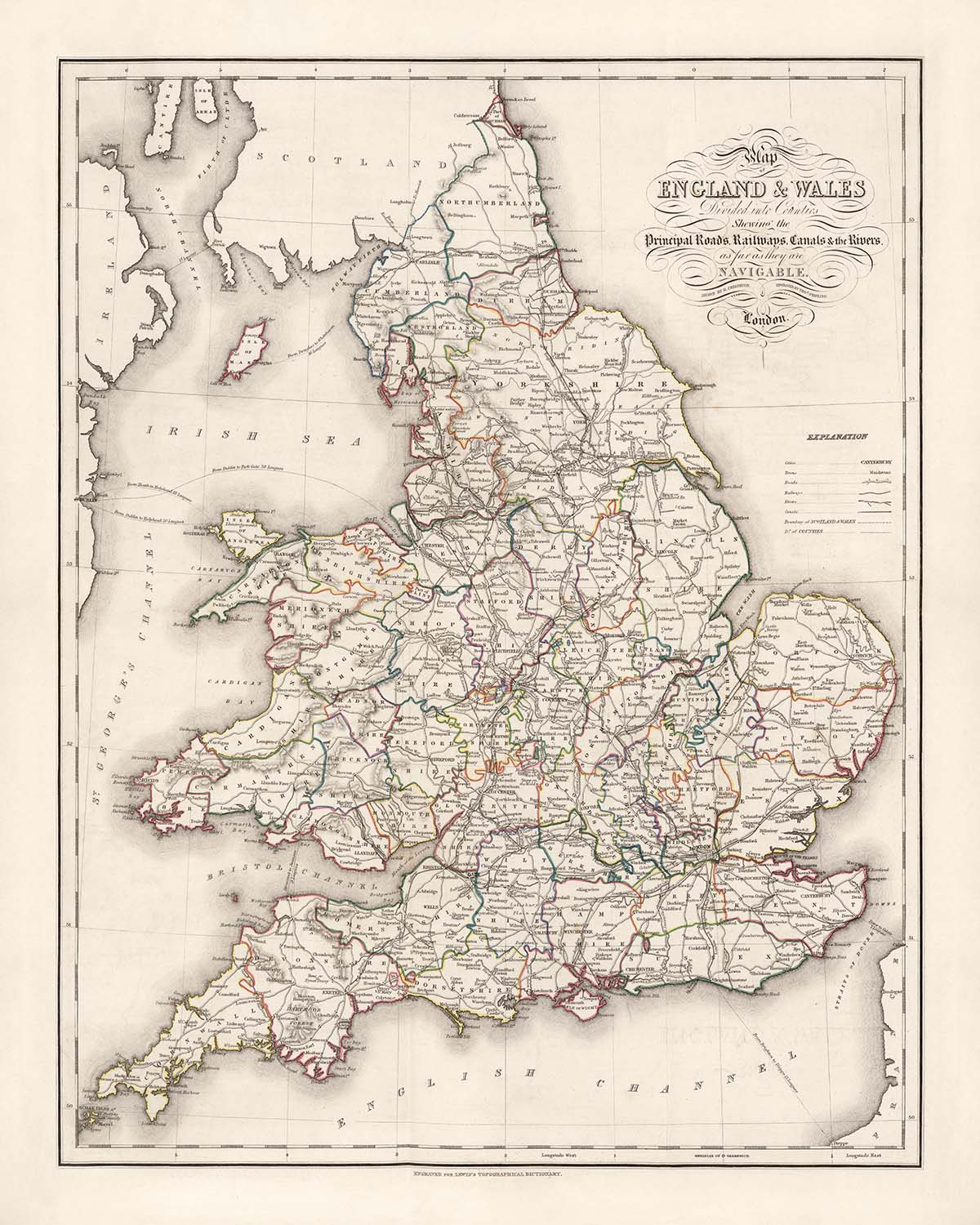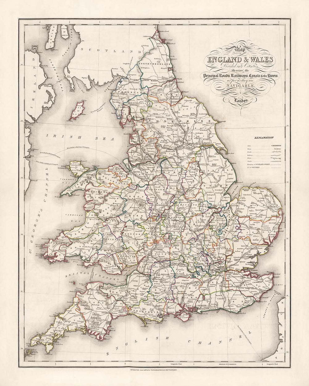 Die Karte ist auch eine Feier der menschlichen Besiedlung und Errungenschaften und zeigt die Standorte von Englands und Wales' berühmtesten Städten und Gemeinden. Von der pulsierenden Metropole London bis zu den industriellen Kraftzentren Birmingham, Manchester und Liverpool ist jede Siedlung sorgfältig positioniert und spiegelt ihre Bedeutung im nationalen Gefüge wider. Kleinere, aber nicht weniger bedeutende Städte – York, Oxford, Cambridge, Exeter, Cardiff, Swansea und viele mehr – sind ebenfalls verzeichnet, deren Namen Jahrhunderte von Geschichte, Kultur und lokaler Identität widerspiegeln. Die Einbeziehung von Brücken, Kanälen und frühen Eisenbahnen hebt weiter den Innovations- und Verbindungsgeist der Ära hervor.