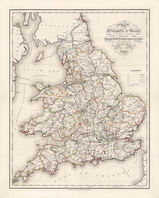 Diese Karte bietet einen faszinierenden Einblick in die physische und administrative Landschaft von England und Wales während eines entscheidenden Zeitraums in der Geschichte. Die Grafschaften sind kühn umreißt, mit ihren Grenzen in lebendigen Farben hervorgehoben, während die nationale Grenze zwischen England und Wales deutlich markiert ist. Wichtige Flüsse wie die Themse, Severn, Mersey und Trent schlängeln sich über die Karte und dienen sowohl als natürliche Grenzen als auch als Lebensadern für Handel und Reisen. Die Irische See, die Nordsee und der Bristolkanal umrahmen die Landmasse, während die Küstenlinie mit exquisiten Details dargestellt ist, die jede Bucht, jeden Flussmündung und jede Halbinsel erfasst.