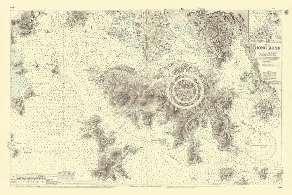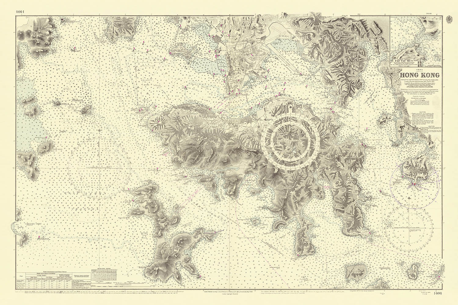 - Erstmals 1843 von der britischen Admiralität veröffentlicht, basierend auf Vermessungen von Sir Edward Belcher und später von anderen Vermessern der Royal Navy aktualisiert. Die Karte zeigt Hongkong im Jahr 1953.