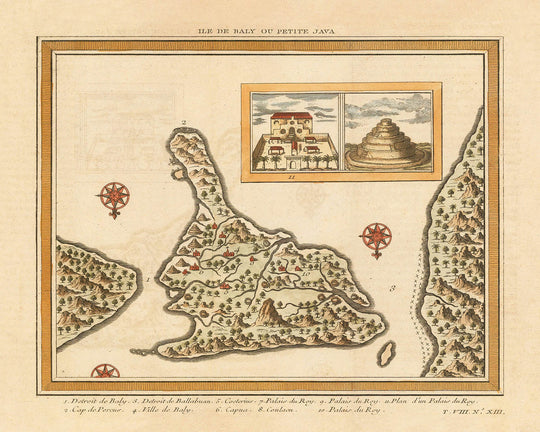 Wichtige politische und kulturelle Wahrzeichen sind sorgfältig markiert, wobei die Paläste des Königs prominent angezeigt werden, was auf die Machtzentren der Insel hinweist. Die Einbeziehung eines Schlüssels oder einer Legende sorgt für Klarheit im reichen Geflecht von Ortsnamen und Merkmalen der Karte, während Illustrationen eines Palastes und eines Tempels eine visuelle Intrige hinzufügen. Diese Elemente verbessern nicht nur die ästhetische Anziehungskraft der Karte, sondern dienen auch als historische Marker für Balis Bedeutung im Handel und in der Erkundung.