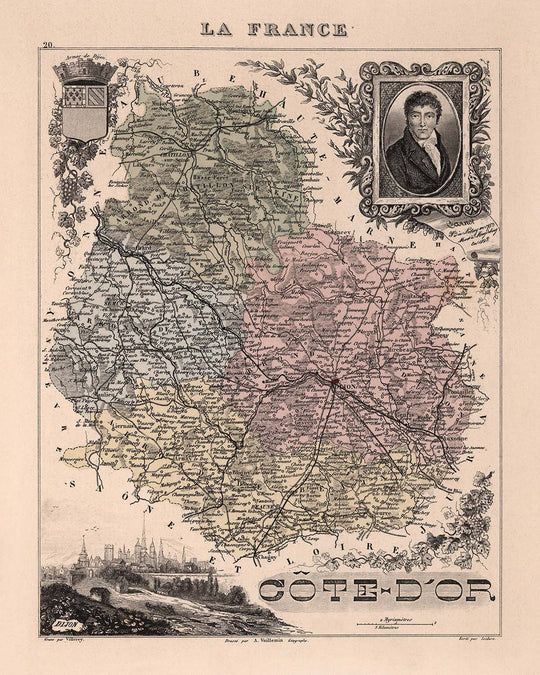 Betreten Sie das Herz des Burgund des 19. Jahrhunderts mit "Côte-d'Or", einem Meisterwerk kartografischer Kunst, das vom renommierten französischen Kartenmacher A. Vuillemin im Jahr 1869 geschaffen wurde. Diese Karte, ursprünglich einfach "Côte-d'Or" betitelt, bietet ein immersives Fenster in eine Region, die für ihr reiches Weinbau-Erbe und ihre geschichtsträchtigen Landschaften gefeiert wird. Vuillemins akribische Liebe zum Detail ist in jeder Kontur und Vignette evident und verwandelt die Karte in ein sowohl navigationsfähiges Werkzeug als auch eine visuelle Feier der lokalen Kultur. Jedes Element ist sorgfältig gestaltet und lädt die Betrachter ein, das komplizierte Gewebe der politischen Grenzen, natürlichen Merkmale und historischen Identität von Côte-d'Or zu erkunden.