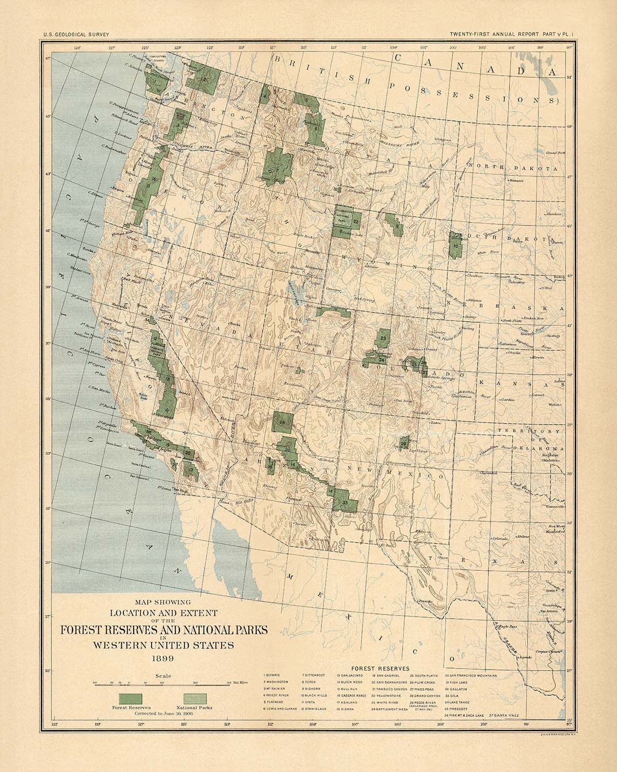 • Name der Karte: Platte I. Die Waldschutzgebiete und Nationalparks im westlichen Vereinigten Staaten, 1899.