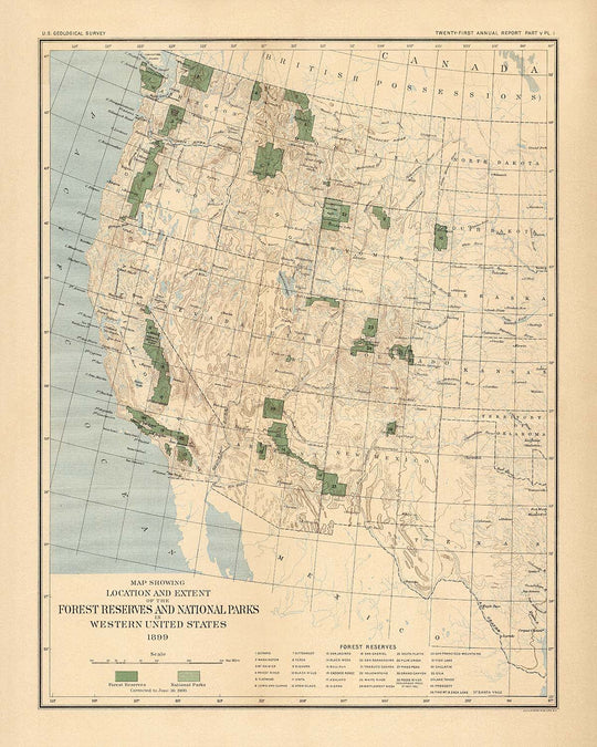 Betreten Sie die Morgendämmerung der amerikanischen Naturschutzbewegung mit "Tafel I. Die Waldreservate und Nationalparks im Westen der Vereinigten Staaten, 1899," einem Meisterwerk der kartografischen Geschichte, das 1900 vom ehrwürdigen US Geological Survey (USGS) geschaffen wurde. Diese Karte ist ein visuelles Zeugnis einer entscheidenden Ära, als die Vereinigten Staaten erstmals ihre Aufmerksamkeit auf die Erhaltung der wilden Pracht ihrer westlichen Länder richteten. Der ursprüngliche Titel der Karte allein weckt den Ehrgeiz und die Vision der Zeit, da er die neu gegründeten Nationalparks und Waldreservate westlich des 97. Meridians sorgfältig kartiert. Dies war eine Zeit, in der die Grenzen zwischen Wildnis und Zivilisation noch verhandelt wurden und die Konturen der amerikanischen Landschaft zum allerersten Mal formal festgehalten wurden.