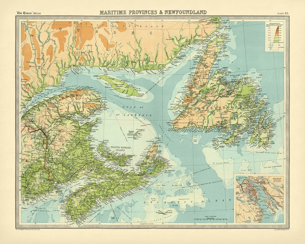 Bartholomews Kunstfertigkeit wird sofort in der Verwendung von hypsometrischen Farbtönen deutlich, einer raffinierten Technik, die Farbverläufe nutzt, um die subtilen Erhebungen des Landes zu offenbaren. Die physische Geographie der Region wird lebendig, von den bewaldeten Cape Breton Highlands bis zu den sanften Hügeln und Flusstälern von New Brunswick. Bathymetrische Schattierungen bringen die umliegenden Meere scharf zur Geltung, wobei die dramatischen Tiefen der Bay of Fundy und des Golfs von St. Lawrence in fesselnden Details dargestellt werden. Die akribische Handkolorierung und elegante Typografie der Karte wecken das goldene Zeitalter der Atlasproduktion und machen sie sowohl zu einem Kunstwerk als auch zu einem Navigationswerkzeug.