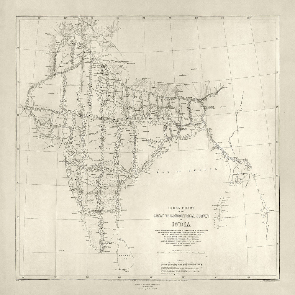 Wenn Sie die Karte erkunden, finden Sie eine detaillierte Darstellung des indischen Subkontinents, einschließlich des heutigen Indiens, Pakistans, Bangladeschs und Teilen der umliegenden Regionen. Das komplexe Netzwerk trigonometrischer Stationen ist deutlich zu erkennen und veranschaulicht die sorgfältige Planung und Durchführung der Vermessung. Die Karte hebt auch bedeutende Gewässer hervor, wie die Bucht von Bengalen und das beeindruckende Himalaya-Gebirge, das durch Triangulationspunkte und Netzwerklinien gekennzeichnet ist. Diese Merkmale bieten einen Einblick in die vielfältige und komplexe Geografie, die die Landvermesser erkunden und dokumentieren mussten.