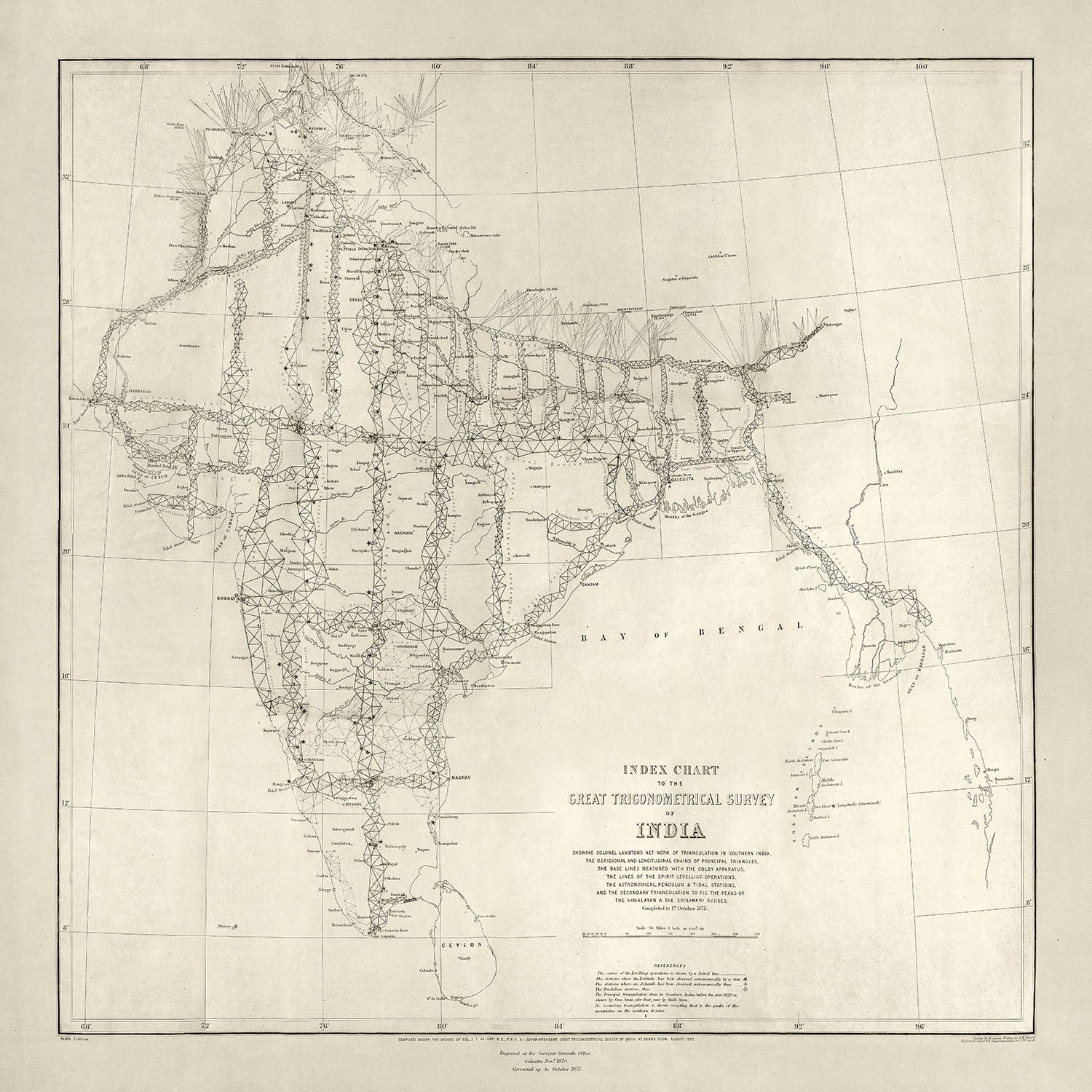Die „Indexkarte der Großen Trigonometrischen Vermessung Indiens“ ist ein faszinierendes historisches Artefakt, das die Essenz eines der ehrgeizigsten wissenschaftlichen Vorhaben des 19. Jahrhunderts einfängt. Diese Karte wurde 1875 vom Office of the Trigonometrical Survey of India erstellt und zeigt detailliert das ausgedehnte Netzwerk trigonometrischer Stationen, das sich über den gesamten indischen Subkontinent erstreckt. Die Große Trigonometrische Vermessung, die von der East India Company initiiert wurde, war ein monumentales Projekt, dessen Ziel darin bestand, die weiten und vielfältigen Landschaften Indiens mit beispielloser Präzision zu kartieren. Diese Karte ist ein Beweis für die wissenschaftliche Genauigkeit und Hingabe der Landvermesser, die diese gewaltige Aufgabe über sieben Jahrzehnte hinweg bewältigten.