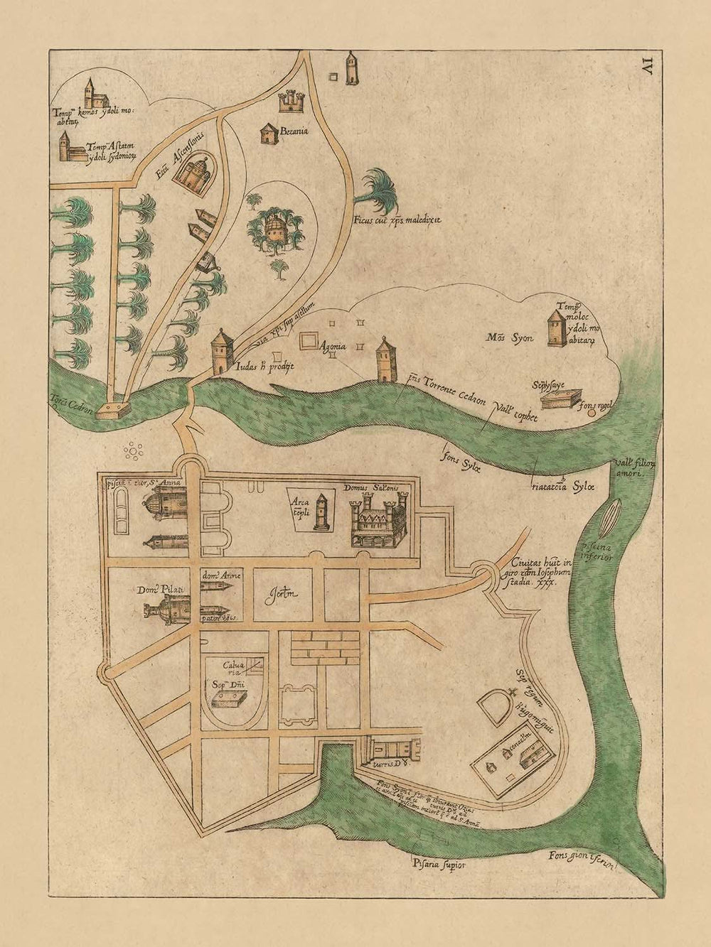 Beim Erkunden dieser Karte werden Sie eine Fülle historischer Zusammenhänge entdecken, die in ihr Design eingewoben sind. Die Karte zeigt nicht nur die physische Struktur Jerusalems, sondern bietet auch Einblicke in das kulturelle und religiöse Milieu der Zeit. Die Straßen, die in die Stadt hinein und aus ihr heraus führen, sowie die Darstellung bedeutender Täler und Quellen bieten einen umfassenden Überblick über die Geographie der Stadt. Diese Karte dient sowohl als historisches Dokument als auch als Kunstwerk und fängt das Wesen einer Stadt ein, die im Mittelpunkt zahlloser historischer Ereignisse stand.