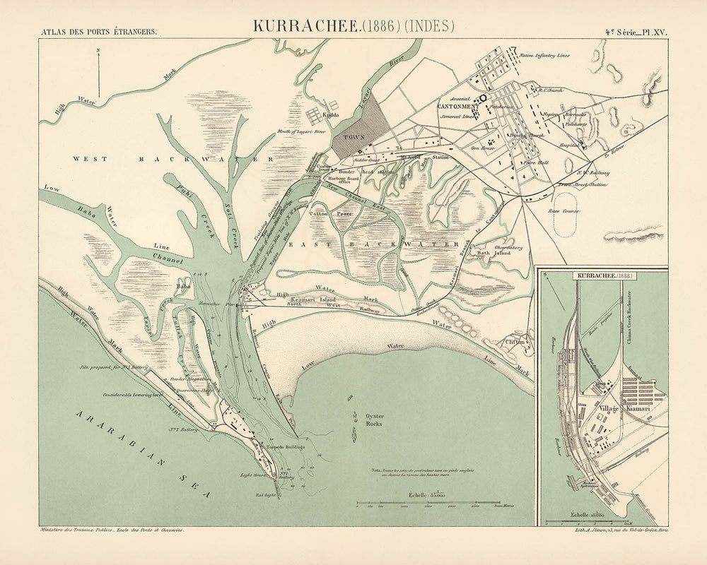 Erforschen Sie die komplexe Schönheit von "Kurrachee (1886) (Indes)," einer faszinierenden Stadtkarte, die einen Einblick in das historische Gefüge von Karachi, Pakistan, im späten 19. Jahrhundert bietet. Diese sorgfältig gestaltete Karte, erstellt vom französischen Ministère des travaux publics, Administration des routes, im Jahr 1888, ist ein Zeugnis für Karachis zentrale Rolle im globalen maritimen Handel. Mit ihrer detaillierten Darstellung des geschäftigen Hafens fängt die Karte das Wesen einer Stadt ein, die an der Schnittstelle von Geschichte und Handel steht.