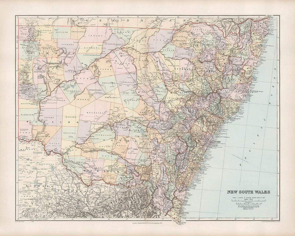 Die Karte mit dem Titel "New South Wales" von Edward Stanford, erstellt im Jahr 1904, ist ein Zeugnis der Kunst der Kartographie zu Beginn des 20. Jahrhunderts. Stanford, eine herausragende Persönlichkeit in der Welt der Kartenherstellung, erwarb die Platten von John Arrowsmiths London Atlas, was ihm ermöglichte, auf einem Erbe detaillierter geografischer Dokumentation aufzubauen. Diese Karte ist Teil eines Atlas, der erstmals 1887 herausgegeben wurde und Arrowsmiths Werk von 1858 nachfolgte. Das filigrane Design und die lebendige Farb-Lithografie machen sie zu einem herausragenden Stück, das sowohl politische als auch physische Landschaften mit Präzision und Kunstfertigkeit widerspiegelt.