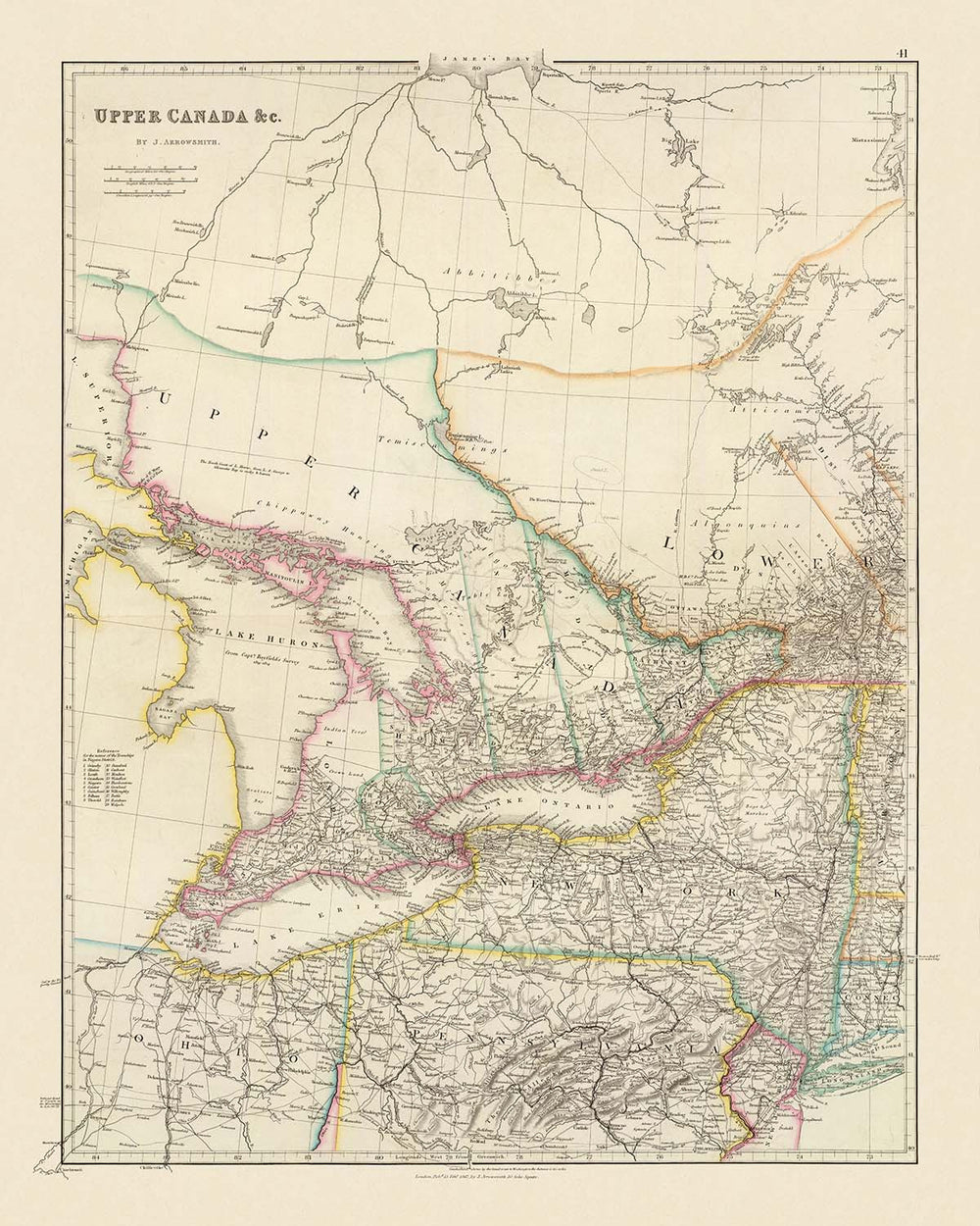 John Arrowsmith, Spross der illustren Arrowsmith-Kartographiedynastie, war bekannt für seinen innovativen Ansatz beim Kartenzeichnen. Seine Atlanten, insbesondere die erweiterte Ausgabe von 1842–1844, aus der diese Karte stammt, sind für ihre Klarheit und Modernität gefeiert und heben sich unter den besten geografischen Werken der Ära hervor. Die Aufnahme von fünfzehn zusätzlichen Karten in dieser Ausgabe, die von Texas bis zu den entlegensten Regionen Afrikas und Asiens reichen, unterstreicht Arrowsmiths Engagement für umfassende globale Abdeckung. Doch es ist seine sorgfältige Abgrenzung von Oberkanada – unter Verwendung von Umrissfarben und präzisen Verwaltungseinheiten – die dieses Stück hervorhebt und einen Einblick in koloniale Ambitionen und Organisation auf ihrem Höhepunkt bietet.