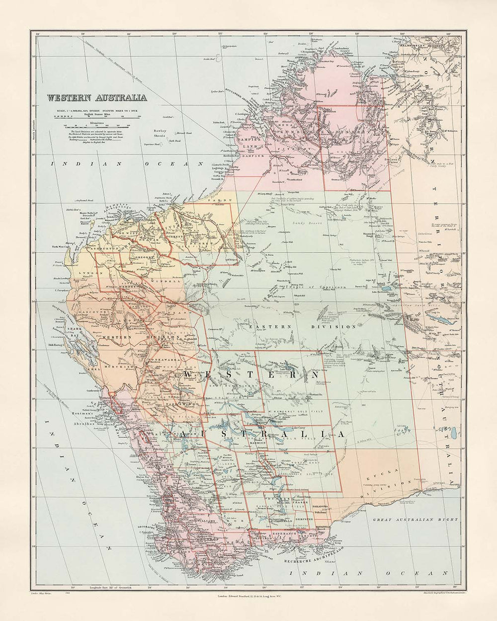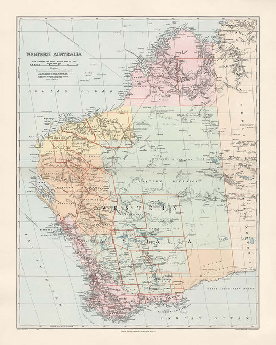 Betreten Sie das goldene Zeitalter der Erkundung mit "Western Australia. Northern Territory.", einer exquisiten Karte von 1904, die vom angesehenen Londoner Kartografen Edward Stanford erstellt wurde. Diese Karte, die ursprünglich Teil von Stanfords gefeierter Atlasreihe war, bietet einen lebendigen Überblick über Westaustralien und das Northern Territory zu Beginn des zwanzigsten Jahrhunderts. Der Titel selbst weckt eine Zeit, in der diese weiten Regionen noch kartiert wurden, ihre Grenzen, Siedlungen und Landschaften sorgfältig für die Nachwelt dokumentiert wurden. Stanfords Karten sind für ihre Genauigkeit und Kunstfertigkeit bekannt, und dieses Stück ist keine Ausnahme, es verbindet wissenschaftliche Präzision mit der Eleganz der Farblithografie.