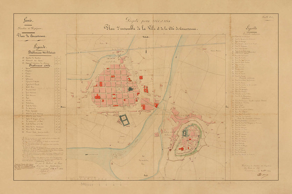 Der „Plan d'ensemble de la Ville et de la Cité de Carcassonne“, der 1854 unter der Leitung von Eugène-Emmanuel Viollet-le-Duc und Colonel de Rivieres erstellt wurde, ist ein bemerkenswerter Beweis für das Zusammentreffen von Stadtgeschichte, Militärarchitektur und der aufkommenden Wissenschaft der Denkmalpflege. Diese handschriftliche Stadtkarte erfasst Carcassonne in einem entscheidenden Moment—gerade als die weltbekannte Restaurierung beginnen sollte—und bietet einen seltenen und authentischen Schnappschuss der mittelalterlichen Befestigungen der Stadt, der lebhaften Unterstadt und des komplexen Zusammenspiels zwischen alten und modernen Stadtformen. Der ursprüngliche französische Titel selbst ruft die umfassende Vision seiner Schöpfer hervor, die jeden Bastion, jede Brücke und jeden Boulevard sorgfältig dokumentierten, um sich auf die bevorstehenden umfassenden Veränderungen vorzubereiten.