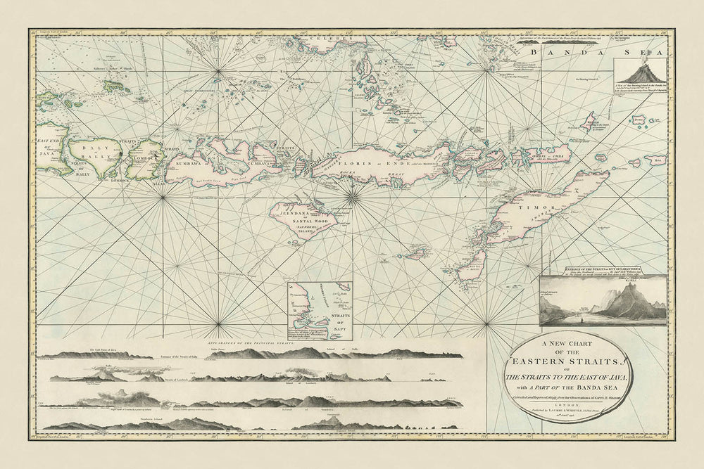 Laurie & Whittles Liebe zum Detail zeigt sich im Design der Karte, die Einschubansichten und Küstenprofile umfasst, die das Verständnis des Betrachters für die Topografie der Region bereichern. Die Darstellung der Sundstraßen von Larantooca und einer Vulkaninsel im Banda-Meer fügt Schichten von Intrigen hinzu und lädt den Betrachter ein, tiefer in die geografischen und geologischen Merkmale des Gebiets einzutauchen. Diese Elemente, kombiniert mit den navigationalen Hilfsmitteln der Karte wie Kompassrosen und Tiefenangaben, machen sie zu einer unschätzbaren Ressource für das Verständnis historischer Navigationsmethoden.