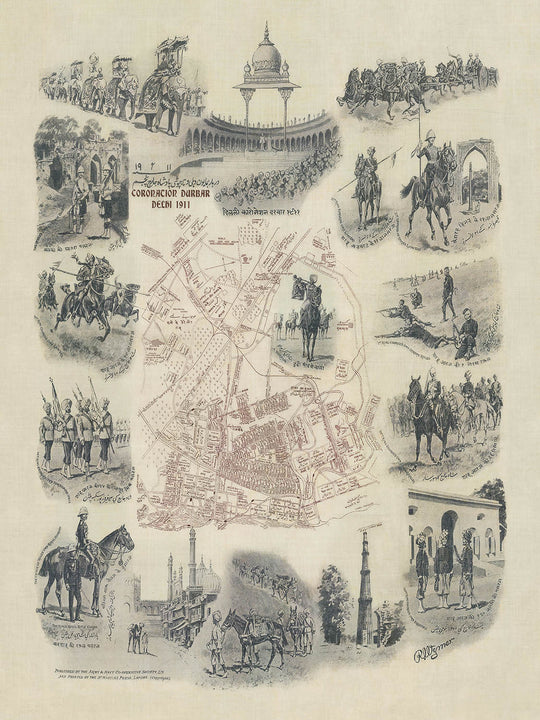 - Die Karte zeigt einen kleinen Teil von Delhi, umgeben von wunderschönen Abbildungen des Durbar.