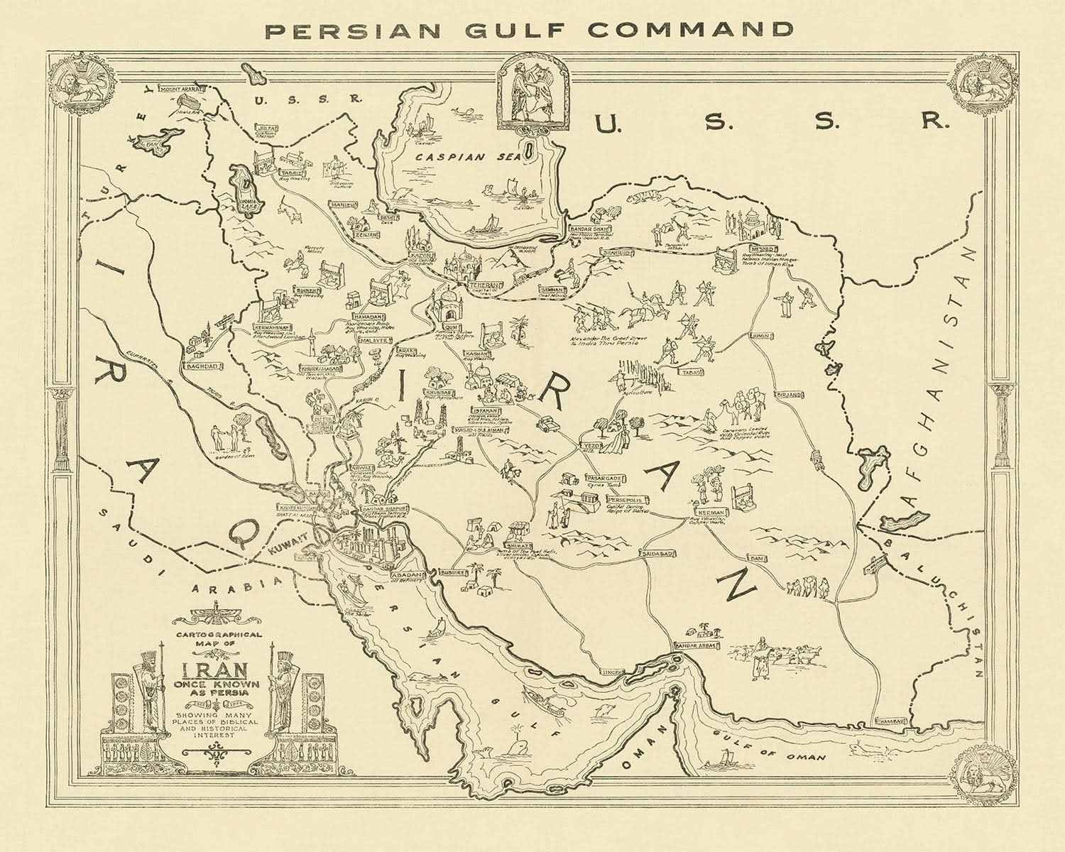 Die "Kartographische Karte von Iran, einst als Persien bekannt, die viele Orte biblischen und historischen Interesses zeigt" ist ein fesselndes Stück Geschichte, das 1943 vom Persischen Golfkommando gefertigt wurde. Diese Karte ist nicht nur eine geografische Darstellung; sie ist ein Fenster in das reiche Geflecht Irans während des Zweiten Weltkriegs. In Teheran erstellt, spiegelt sie die strategische Bedeutung der Region wider und dient sowohl militärischen als auch kulturellen Zwecken. Die Karte ist mit charmanten Vignetten geschmückt, die die historischen und touristischen Merkmale Irans hervorheben und sie zu einer einzigartigen Mischung aus Kunst und Kartografie machen.