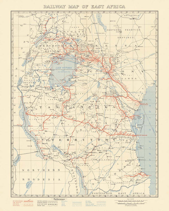 Die Karte veranschaulicht lebhaft die geografische Vielfalt Ostafrikas, wobei markante Merkmale wie der Victoriasee und der imposante Kilimandscharo subtil in das Design integriert sind. Die kolonialen Grenzen von Kenia, Tanganyika und Uganda sind klar abgegrenzt und bieten Einblicke in die politische Landschaft der damaligen Zeit. Diese Grenzen, zusammen mit den Verkehrswegen, zeichnen ein Bild einer Region, die am Rande der Transformation steht und bereit ist, die Modernisierung zu umarmen, während sie weiterhin unter kolonialem Einfluss steht.