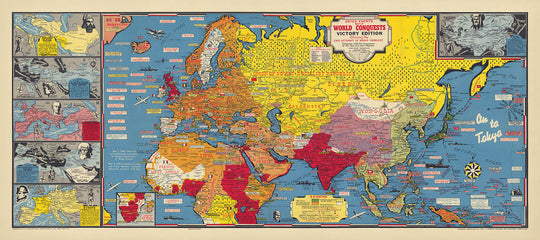 Die "Datierten Ereigniskarte der Welt Eroberungen, Siegesausgabe" ist eine fesselnde Kreation des renommierten Kartografen Stanley Turner, geschaffen im entscheidenden Jahr 1945. Diese Karte bietet eine lebendige Darstellung der östlichen Hemisphäre während der turbulenten Zeit des Zweiten Weltkriegs. Turner, bekannt für seine thematischen und detaillierten kartografischen Werke, hat die geopolitischen Verschiebungen und Machtverhältnisse der Ära mit bemerkenswerter Klarheit eingefangen. Diese Karte dient sowohl als historisches Dokument als auch als Kunstwerk, das die Komplexität globaler Konflikte und den letztendlichen Triumph der Alliierten widerspiegelt.