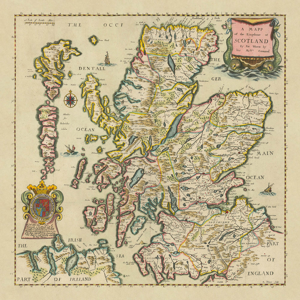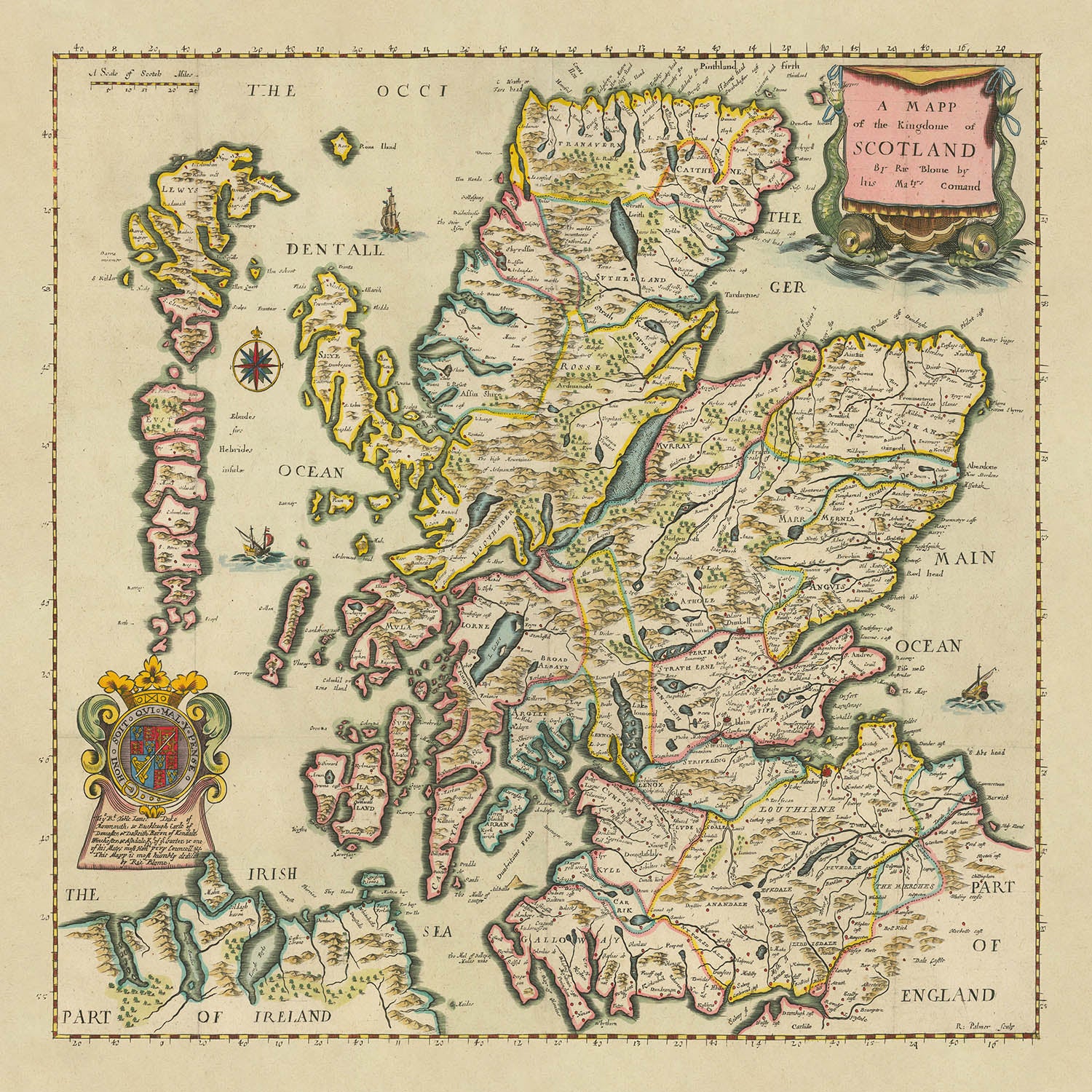 Richard Blome, der Schöpfer der Karte, war ein angesehener englischer Kartograf und Verleger, dessen Arbeit dazu beitrug, das goldene Zeitalter der britischen Kartografie zu prägen. Sein „Britannia“, der Atlas, in dem diese Karte erstmals erschien, war eine wegweisende Veröffentlichung, die detaillierte Kreis- und Regionskarten zusammenbrachte und Genauigkeit mit dekorativem Flair verband. Blomes Karten sind bekannt für ihre fein gravierten Linien, aufwendige Ornamentik und heraldische Verzierungen, die alle in dieser Darstellung Schottlands evident sind. Sein Engagement, praktische Geografie mit künstlerischer Ausschmückung zu verbinden, machte seine Karten bei der Aristokratie und anspruchsvollen Sammlern seiner Zeit sehr begehrt.