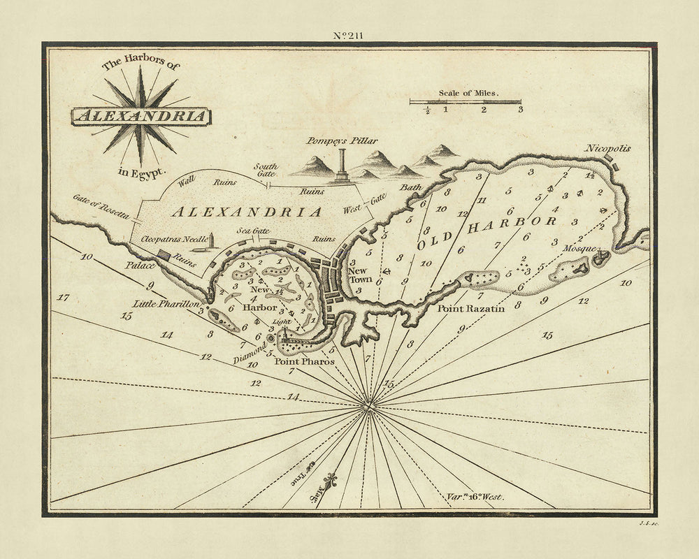 Darüber hinaus scheut sich die Karte nicht, Alexandrias architektonisches Erbe zu präsentieren. Sie markiert sorgfältig die Standorte von Stadtmauern, Toren und sogar den alten Straßen, neben bemerkenswerten Ruinen wie Pompejus' Säule, Cleopatras Nadel und Nicopolis. Diese Elemente leiten nicht nur den Seemann, sondern bilden auch eine Bildungsquelle für Historiker, Archäologen und neugierige Reisende über das reiche Geflecht historischer Erzählungen, das Alexandria verkörpert.