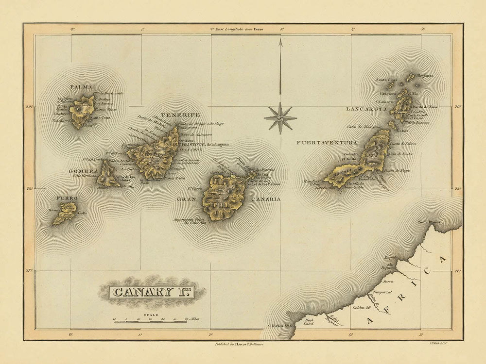 Alte seltene Karte der Kanarischen Inseln von Lucas, 1823: Teneriffa, Gran Canaria, Kompassrose, Berge, Atlantik