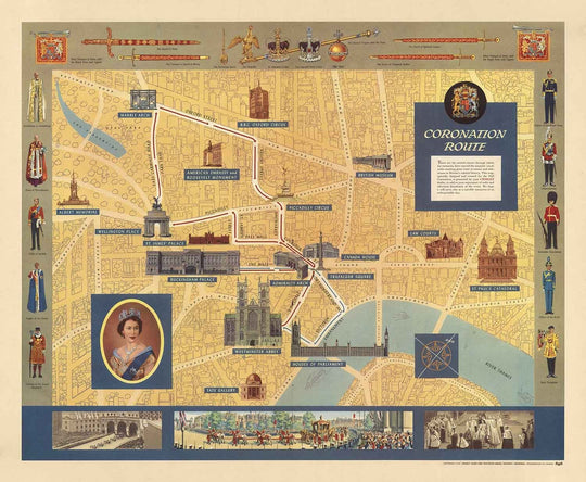 Die äußerst attraktiven Illustrationen auf und um die Karte bringen die Krönung wirklich zum Leben, mit detaillierten Ansichten wichtiger Wahrzeichen, der an der Krönung beteiligten Personen und sogar einer Ansicht der Goldenen Staatskarosse.