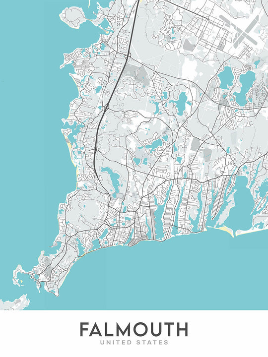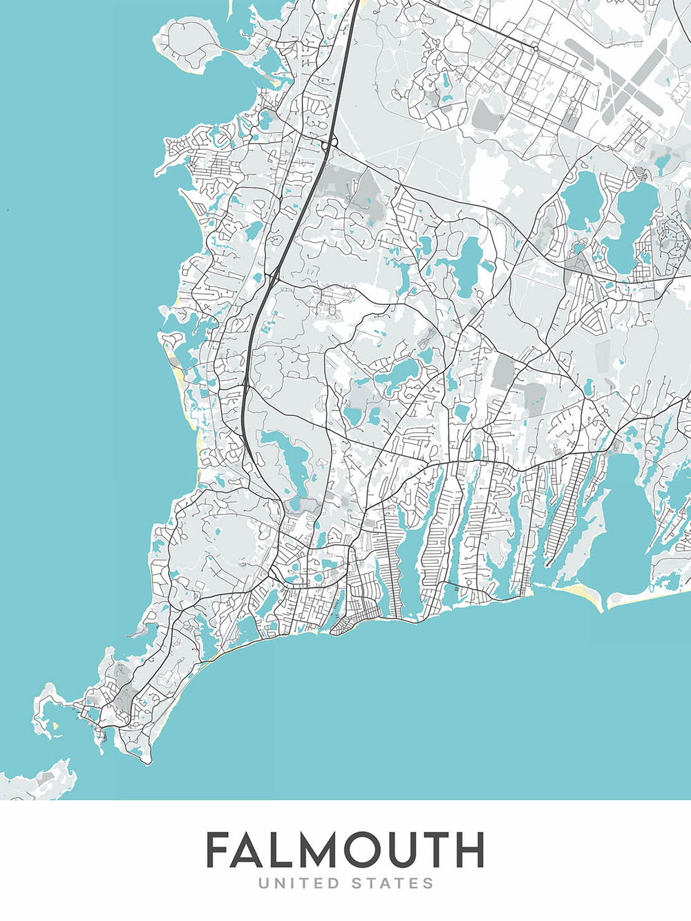 Falmouth ist eine Stadt voller Geschichte und natürlicher Schönheit, und diese Karte fängt ihr Wesen perfekt ein. Die Karte umfasst die lebhaften Viertel Falmouth Heights, Falmouth Center, North Falmouth, Teaticket, West Falmouth und Woods Hole, jedes mit seinem eigenen Charakter und Charme. Es umfasst auch die Nachbarstädte Mashpee und Sandwich, was die Reichweite der Karte erweitert und einen Einblick in die weitere Region bietet.