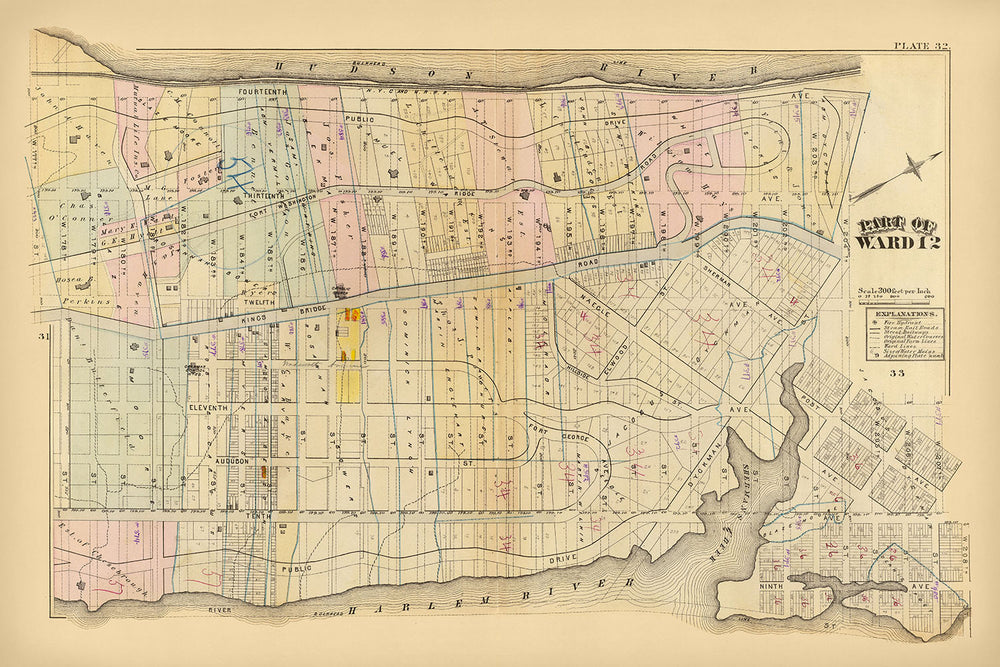 Ein weiteres bemerkenswertes Highlight ist der Fort Washington Park, der auf der Karte prominent dargestellt ist. Diese weitläufige Grünfläche bot den Bewohnern eine dringend benötigte Ruhepause von der geschäftigen Stadtumgebung und einen Ort zur Erholung und Entspannung. Die historische Bedeutung des Parks wird durch seine Verbindung mit Fort Washington noch weiter verstärkt, was ihn zu einem geschätzten Wahrzeichen macht, das die New Yorker auch heute noch genießen.