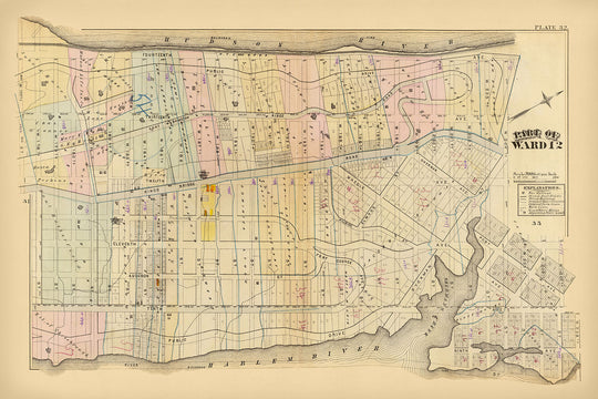 Alter Stadtplan von Harlem, NYC von Bromley, 1879: Fort Washington, Fort George, Hudson River, Harlem River
