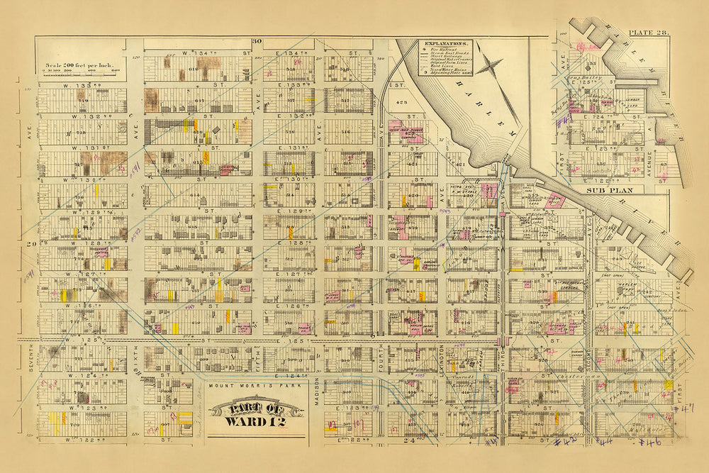 Eine der herausragenden Eigenschaften dieser Karte ist die Darstellung des Mount Morris Parks, eines bedeutenden Grünraums, der als wichtiges Erholungsgebiet für die Anwohner dient. Die Einbeziehung des Parks hebt die Bedeutung öffentlicher Räume in der Stadtplanung dieser Zeit hervor. Darüber hinaus veranschaulicht die Karte den Harlem River, eine wichtige Wasserstraße, die eine entscheidende Rolle in der Verkehrsanbindung und wirtschaftlichen Entwicklung der Stadt gespielt hat. Die Präsenz des Flusses unterstreicht die Verknüpfung der natürlichen und gebauten Umgebungen von New York City.