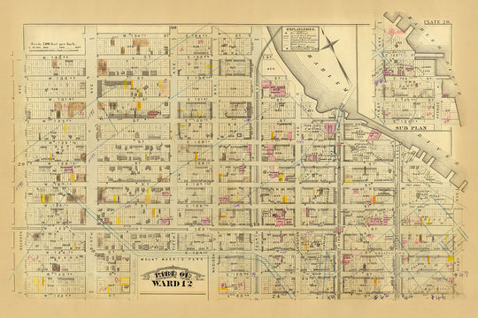 Die Karte enthält auch einen Inset-Plan, der eine weitere Ebene der Tiefe zu ihrer historischen Erzählung hinzufügt. Dieser Inset bietet einen genaueren Blick auf bestimmte Abschnitte von Ward 12 und ermöglicht eine detailliertere Untersuchung von Grundstücksaufteilungen und Landnutzung. Die Farbkennzeichnung, die zwischen Wohn- und Gewerbeimmobilien unterscheidet, verbessert zusätzlich die Nützlichkeit und ästhetische Anziehungskraft der Karte. Dieses durchdachte Designelement spiegelt Bromleys Engagement wider, Karten zu erstellen, die sowohl informativ als auch visuell beeindruckend sind.
