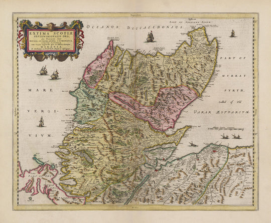 Diese äußerst seltene, alte Farbkartografie der schottischen Highlands wurde von dem Meisterkartenmacher Joan Blaeu aus seiner Werkstatt in Amsterdam erstellt und ursprünglich 1665 als Teil seines Theatrum Orbis Terrarum Sive Atlas Novus veröffentlicht.