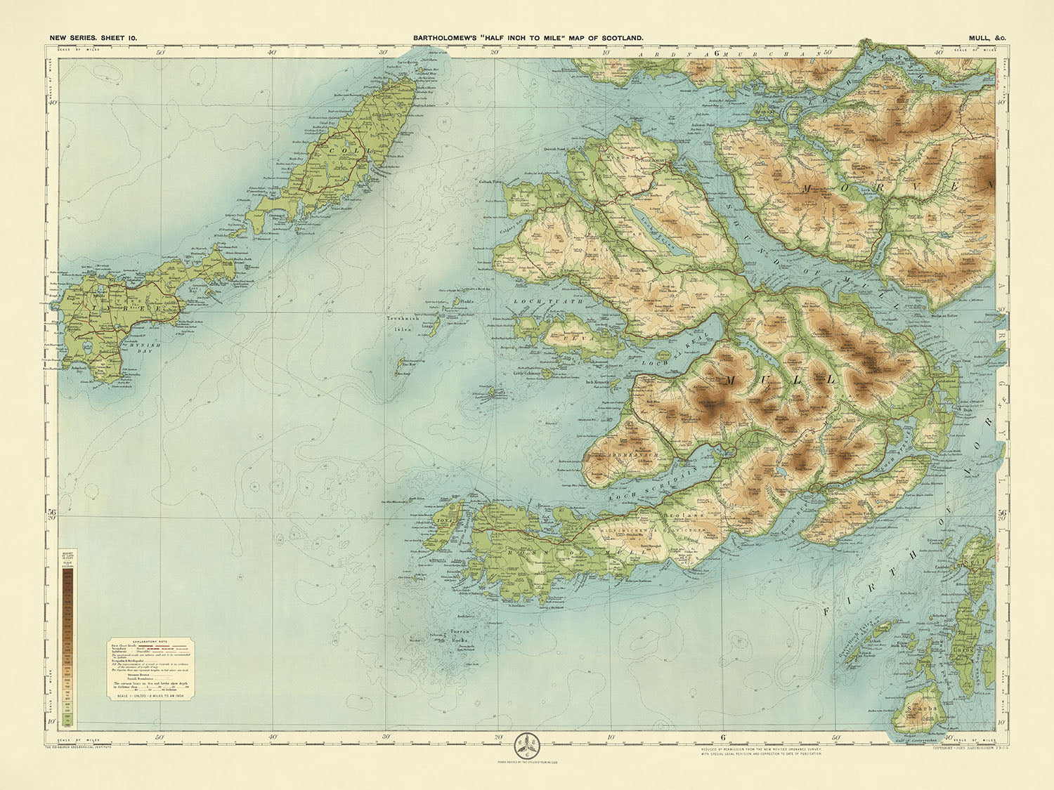 Blatt 10 – Mull, 1901 vom angesehenen Kartografen JG Bartholomew erstellt, ist ein Meisterwerk der Kartografie des frühen 20. Jahrhunderts. Bartholomew, bekannt für seine innovativen und hochwertigen Karten, schuf diese detaillierte Karte im Maßstab 1/2 Zoll, um dem wachsenden Interesse an Radfahren und Tourismus gerecht zu werden. Der Originaltitel der Karte spiegelt ihren Fokus auf die Isle of Mull und ihre Umgebung wider und fängt das Wesen dieser rauen und malerischen Region Schottlands ein. Die Klarheit und Präzision der Karte, kombiniert mit der Verwendung von Farbe zur Darstellung des Geländes, machen sie nicht nur zu einem praktischen Hilfsmittel für Reisende, sondern auch zu einem Kunstwerk.