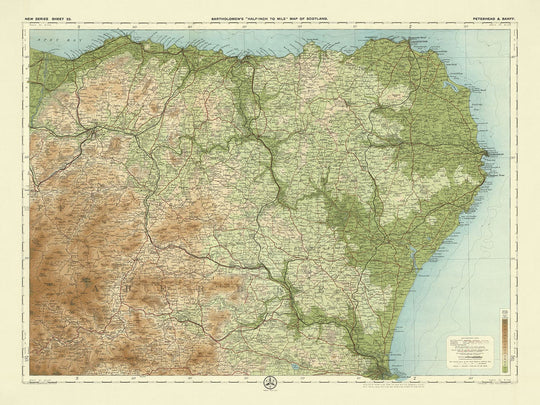 Bartholomews Karte bietet ein reichhaltiges Bild der Regionen Peterhead und Banff und zeigt eine Vielzahl natürlicher und künstlicher Merkmale. Die detaillierte Darstellung von Flüssen wie Deveron, Ythan, Don und Dee sowie die markanten Küstenmerkmale des Moray Firth und der Nordseeküste zeichnen ein umfassendes Bild der Wasserwege der Region. Die Karte hebt auch bedeutende Wälder wie den Forest of Deer und den Durris Forest sowie bemerkenswerte Hügel und Berge wie Bennachie, Hill of Fare und Tap o' Noth hervor und bietet einen Einblick in die abwechslungsreiche Topografie der Region.