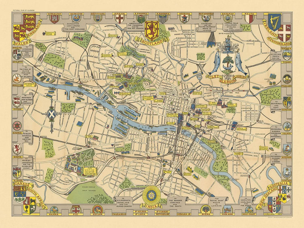 „Let Glasgow Flourish“ ist eine faszinierende historische Karte, die 1938 vom berühmten britischen Kartendesigner Leslie George Bullock entworfen wurde. Dieses bildliche Meisterwerk wurde für die Empire Exhibition geschaffen, ein bedeutendes Ereignis, das die kulturelle und industrielle Stärke Schottlands innerhalb des Britischen Empires zur Schau stellte. Die Karte bietet eine detaillierte Darstellung von Glasgow und hebt das komplexe Straßennetz, die geschäftigen Eisenbahnen und den lebhaften Fluss Clyde hervor, der durch das Herz der Stadt fließt. Bullocks künstlerisches Flair zeigt sich in den dekorativen Elementen, darunter den Wappen, die die Karte einrahmen und die enorme Reichweite des Britischen Empires symbolisieren.