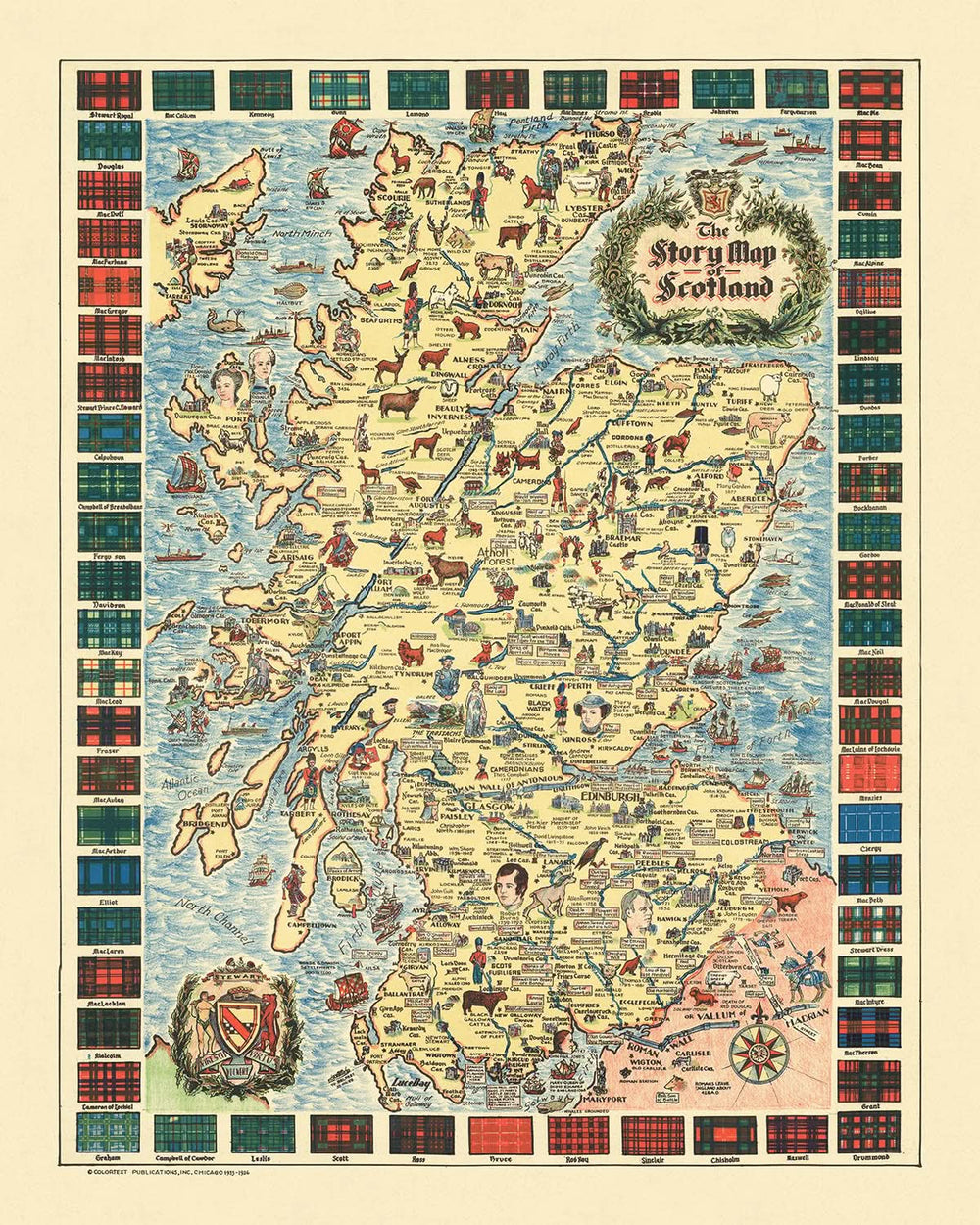 Die Story Map of Scotland, die 1935 von Colortext Publications Inc. erstellt wurde, ist eine fesselnde Mischung aus Kartografie und Geschichtenerzählen. Diese dekorative Bildkarte lädt Sie zu einer Reise durch Schottlands reiche Geschichte und Kultur ein. Die Karte ist mit Abbildungen historischer Figuren, Fabelwesen und bedeutender Ereignisse geschmückt und bietet eine lebendige Erzählung der schottischen Vergangenheit. Jedes Element ist sorgfältig platziert, um einen umfassenden Überblick über das Erbe des Landes zu bieten, wodurch die Karte nicht nur eine Karte, sondern ein visuelles Geschichtenbuch ist.