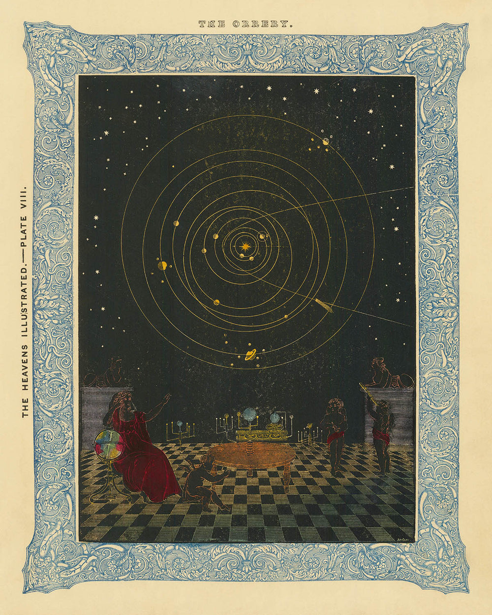 Die Komplexität von Das Planetarium zeigt sich in der zarten Handkolorierung und der detaillierten Darstellung sowohl künstlerischer als auch astronomischer Elemente. Die harmonische Mischung aus tiefen Blau- und Goldtönen, gepaart mit der akribischen Darstellung der Planeten und ihrer Monde, exemplifiziert Bradfords einzigartige Fähigkeit, Kunst mit wissenschaftlichen Fakten zu verbinden. Solche Qualitäten machen dieses Kunstwerk zu einem geschätzten Besitz für jeden Liebhaber von himmlischen Karten oder historischen Illustrationen.