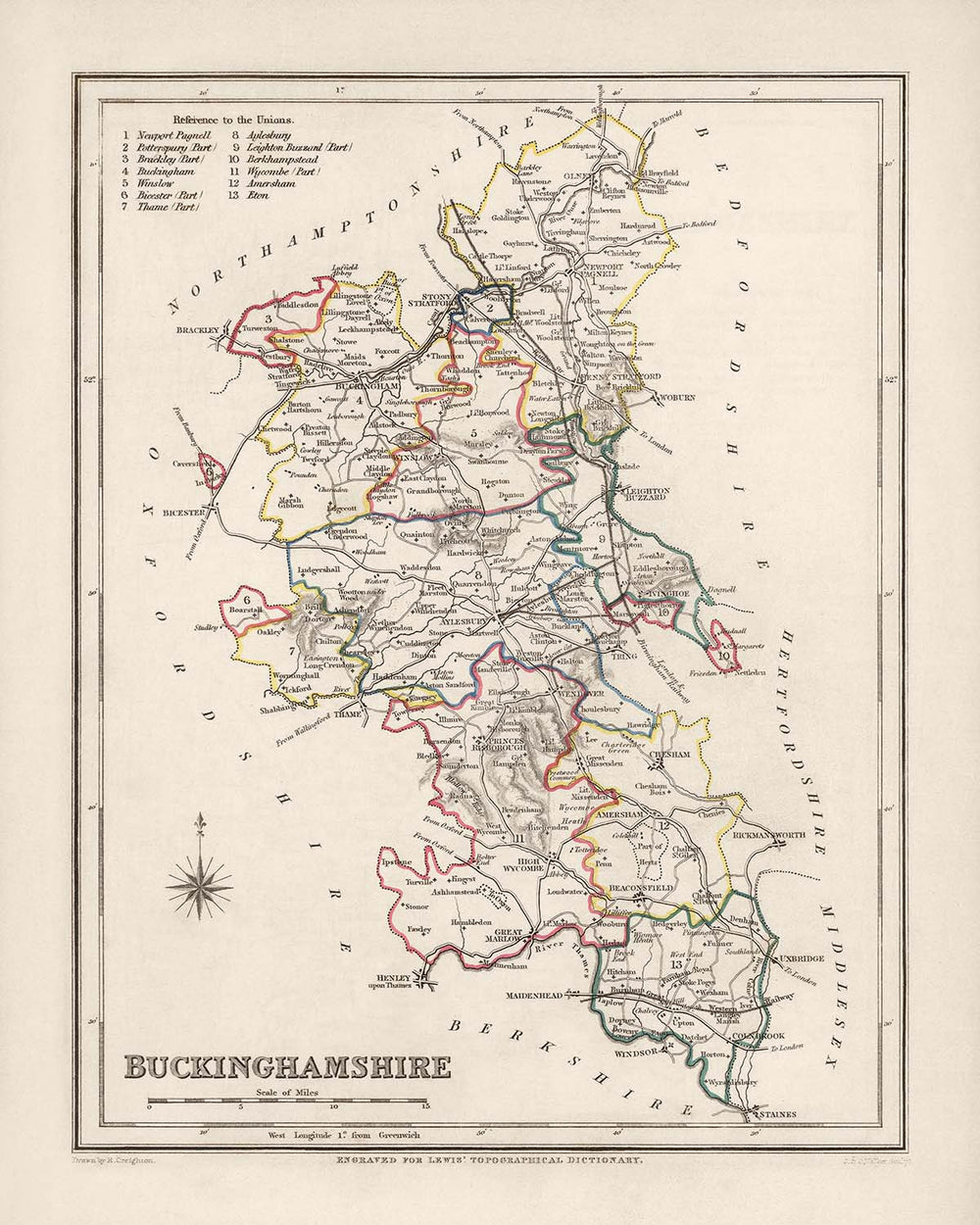 Die alte Karte von Buckinghamshire von Samuel Lewis aus dem Jahr 1844 bietet einen faszinierenden Einblick in die historische Landschaft dieser englischen Grafschaft. Diese hochwertige Karte, sorgfältig erstellt vom renommierten Kartographen Samuel Lewis, bietet eine Fülle faszinierender Details für Geschichtsinteressierte und Kartensammler gleichermaßen.