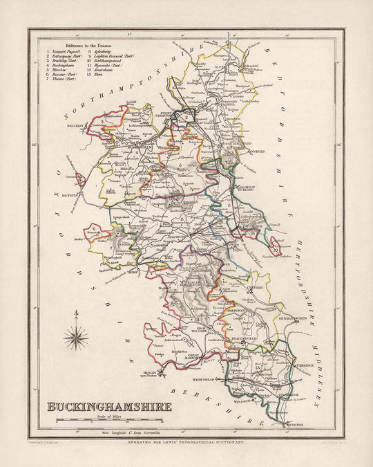 Die alte Karte von Buckinghamshire von Samuel Lewis aus dem Jahr 1844 fängt die Essenz einer vergangenen Ära ein und ermöglicht es Ihnen, die historische Landschaft der Grafschaft zu erkunden und in ihr reiches Erbe einzutauchen.