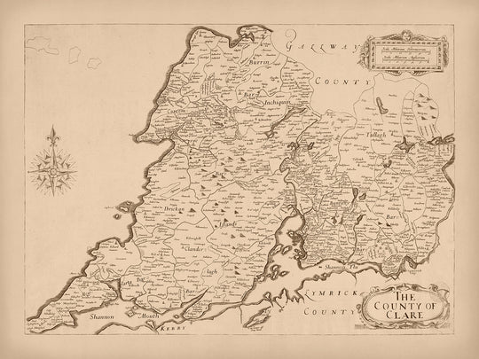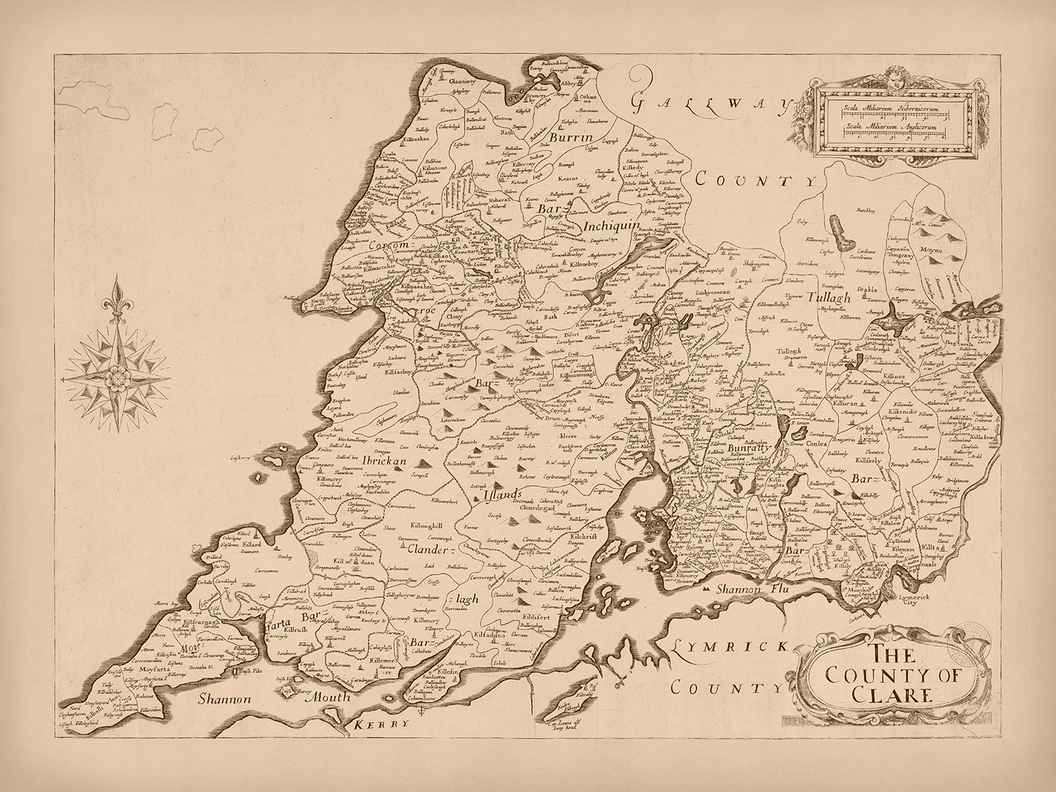 Diese Karte der Grafschaft Clare, ursprünglich 1685 von Sir William Petty veröffentlicht, ist eine detaillierte politische und physische Karte, die eine Fülle von Informationen über die Grafschaft im späten 17. Jahrhundert bietet. Die Karte basiert auf dem Down Survey of Ireland, der ersten detaillierten Landvermessung auf nationaler Ebene weltweit, die zwischen 1656 und 1658 durchgeführt wurde. Pettys Karte ist eine verkleinerte Version des Down Survey, schafft es aber dennoch Erfassen Sie den bemerkenswerten Detaillierungsgrad, der durch die ursprüngliche Umfrage erreicht wurde.