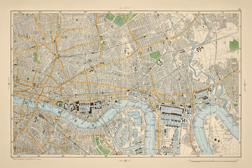 Über die städtische Landschaft hinaus zeigt die Karte die grünen Weiten von Greenwich Marsh und anderen Freiflächen, die einst die Stadt prägten. Diese Gebiete, die sich jetzt verwandelt haben, bieten einen Blick auf die natürliche Schönheit, die einst mit der aufstrebenden Stadtlandschaft koexistierte. Das Gleichgewicht zwischen städtischen und ländlichen Elementen auf dieser Karte hebt die dynamische Entwicklung Londons zu Beginn des Jahrhunderts hervor.