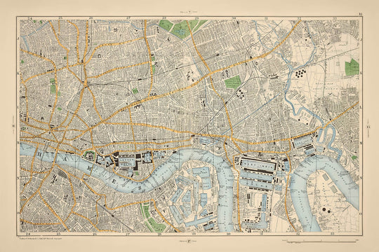 Die Karte zeigt prominent den ikonischen Fluss Thames, eine Lebensader, die durch das Herz Londons fließt. Diese wichtige Wasserstraße, präzise dargestellt, verbindet Schlüsselbereiche wie die London Docks und die West India Docks, die einst die Epizentren des globalen Handels waren. Die Karte veranschaulicht nicht nur die geografische Anordnung, sondern erzählt auch die Geschichte des Handels und der Industrie, die das Wachstum der Stadt während der viktorianischen Ära antrieben.