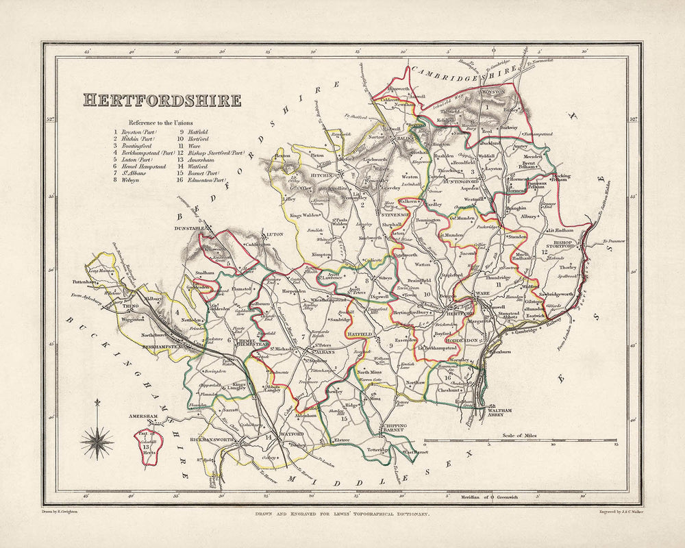 Besitzen Sie ein Stück Geschichte mit der alten Karte von Hertfordshire von Samuel Lewis aus dem Jahr 1844 und tauchen Sie ein in das reiche Erbe und die faszinierenden Landschaften dieser bemerkenswerten Grafschaft.