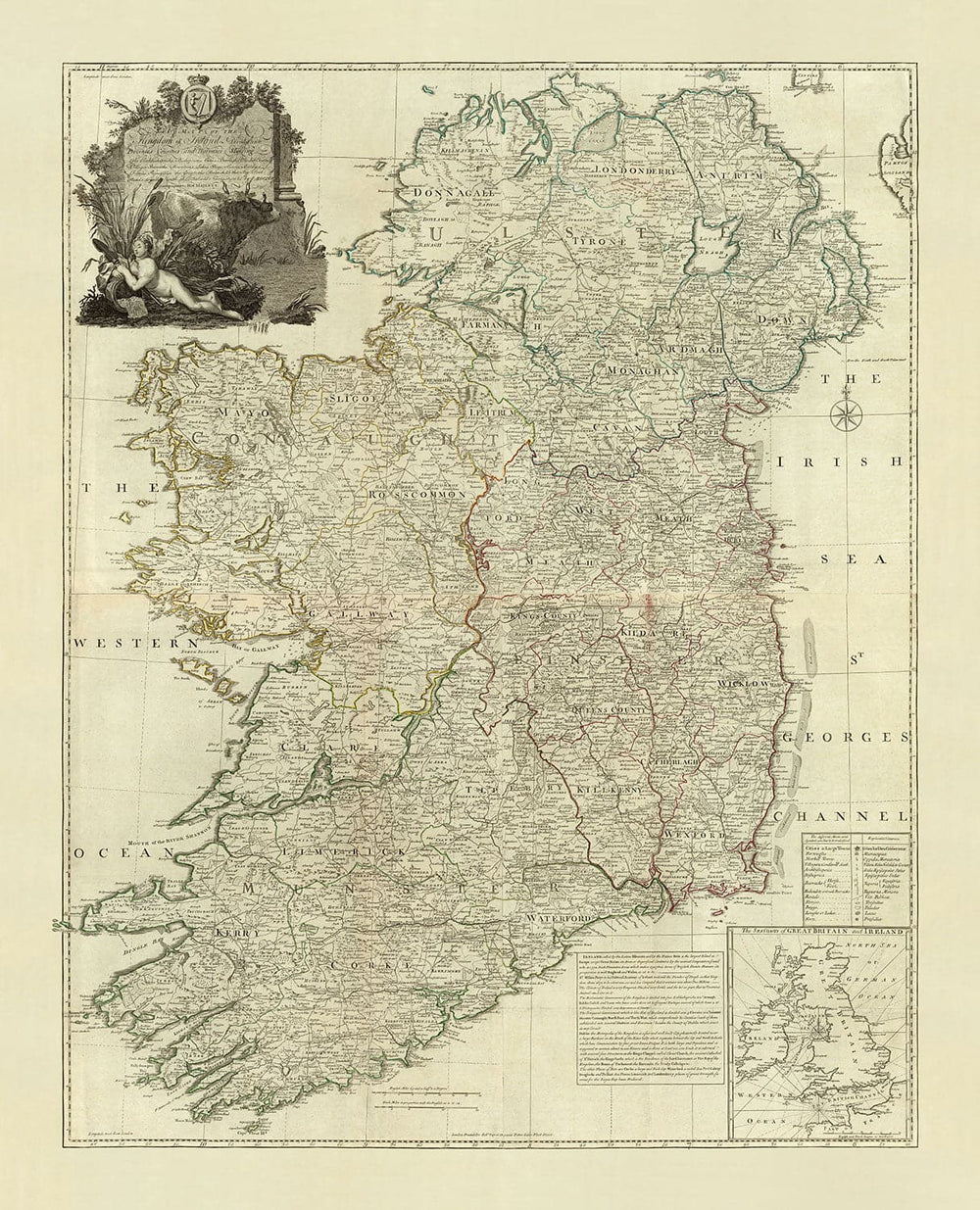 Dies ist eine der schönsten und seltensten alten Karten von Irland, die alle ursprünglichen Grafschaften und Provinzen zeigt. Die Karte bestand ursprünglich aus 4 Blättern, wird hier jedoch als eine einzige Karte mit einem unglaublichen Detailgrad präsentiert.