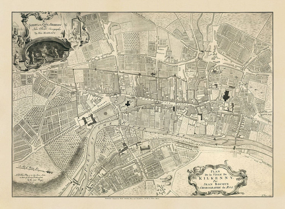 Alte Karte von Kilkenny von John Rocque im Jahr 1758: Fluss Nore, High Street, Gallow's Hill, Saint Patrick's Street