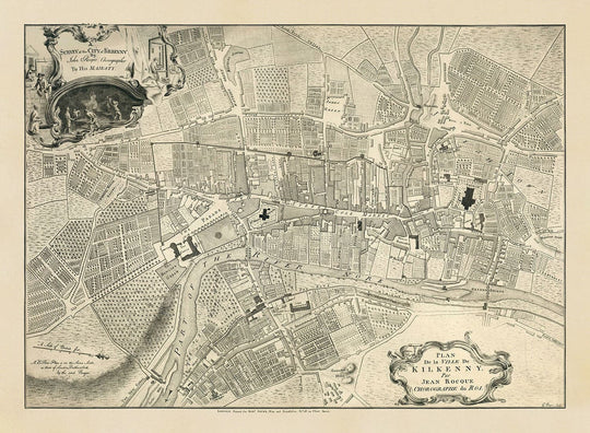 Dies ist die größte alte Karte von Kilkenny, die jemals erstellt wurde. Zusammengetragen von Vermesser und Kartograf John Rocque im Jahr 1758, hat diese Karte ein unglaubliches Detailniveau.