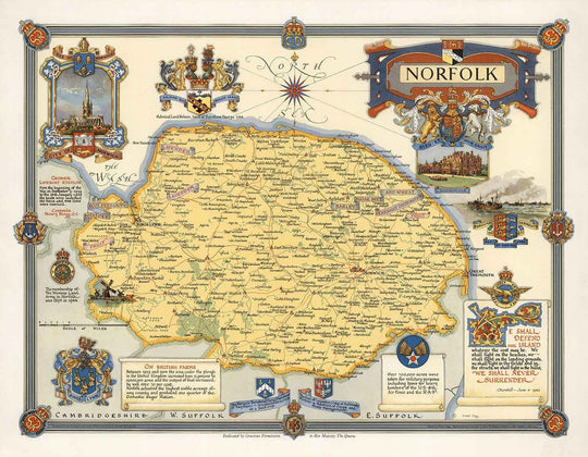 Alte Karte von Norfolk von Ernest Clegg, 1945: Sandringham, Norwich, Yarmouth, Winston Churchill, Lord Nelson, Zweiter Weltkrieg
